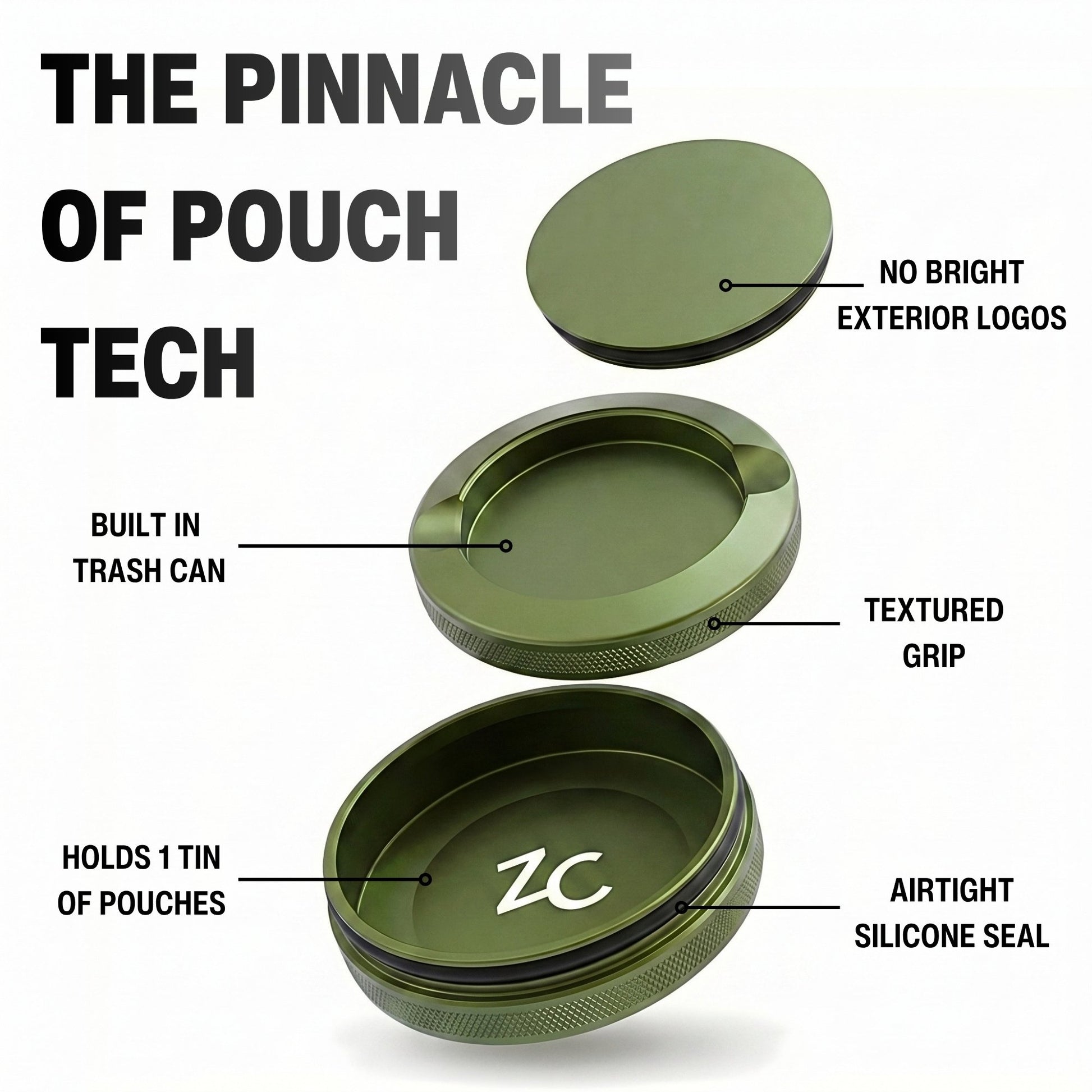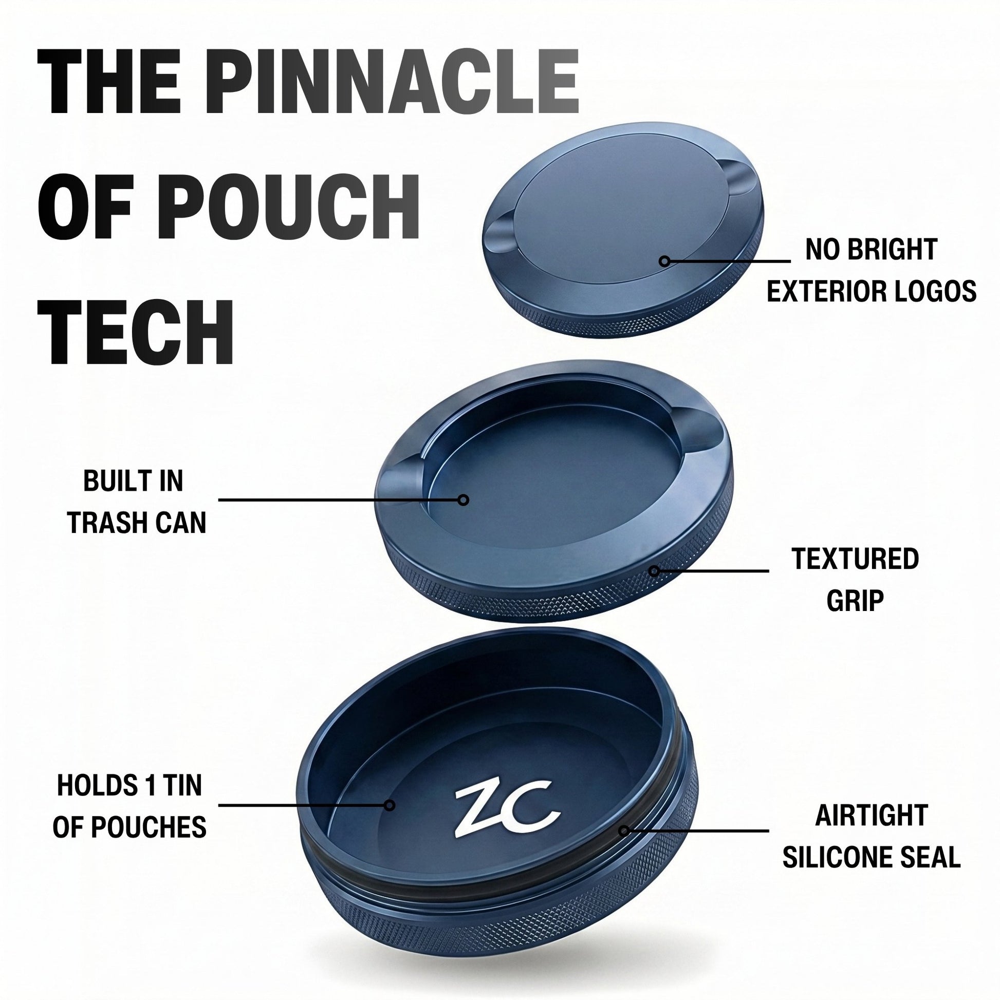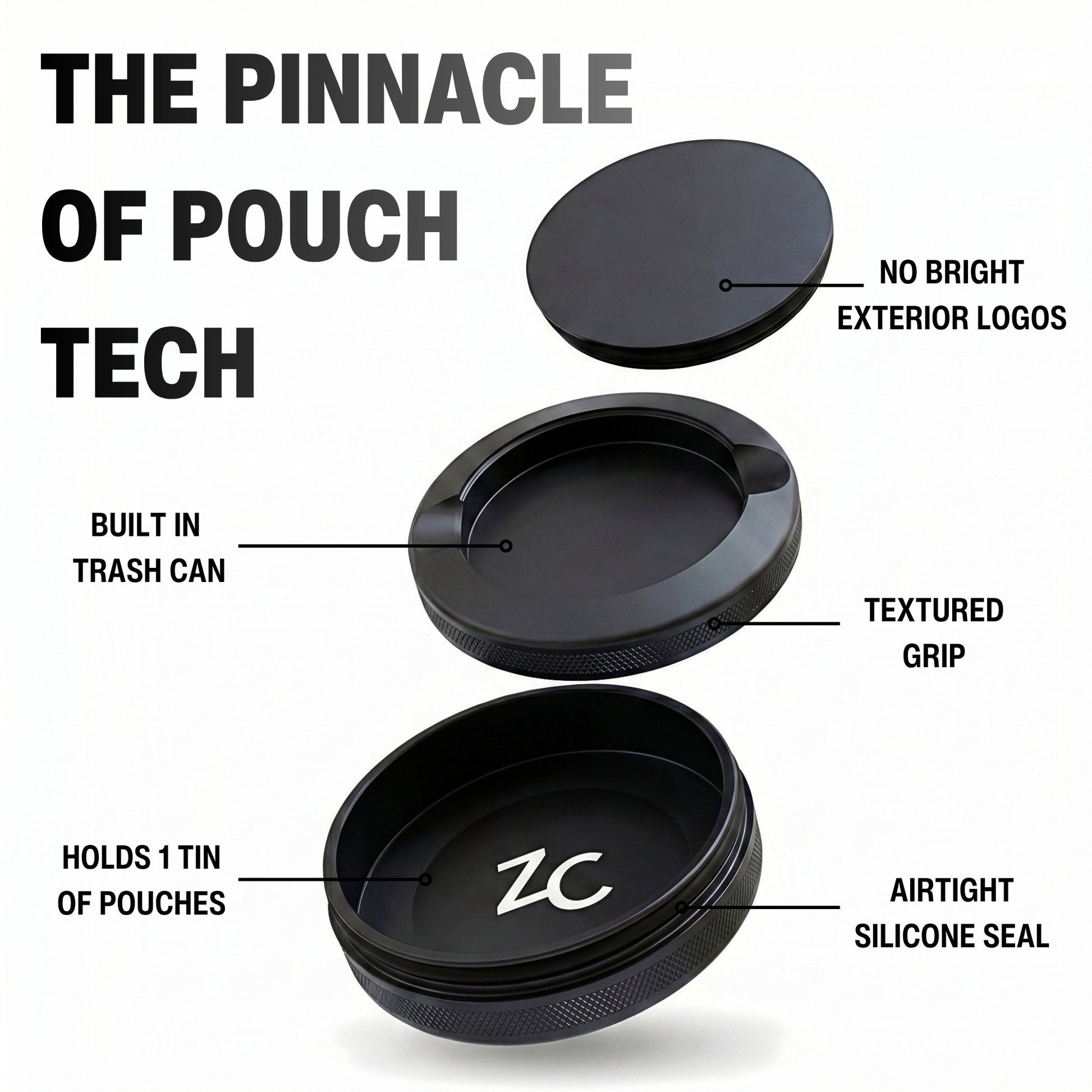 The main chamber stored fresh pouches and is fitted with a rubber seal to keep them fresh. The top chamber is for stashing used pouches till you find a trash can.