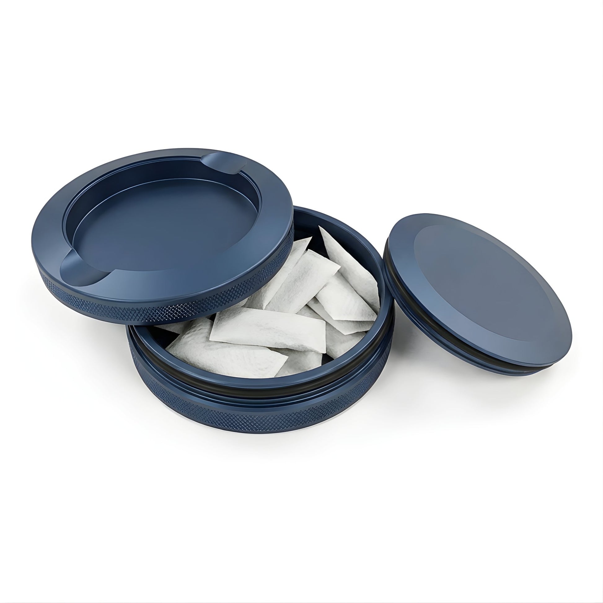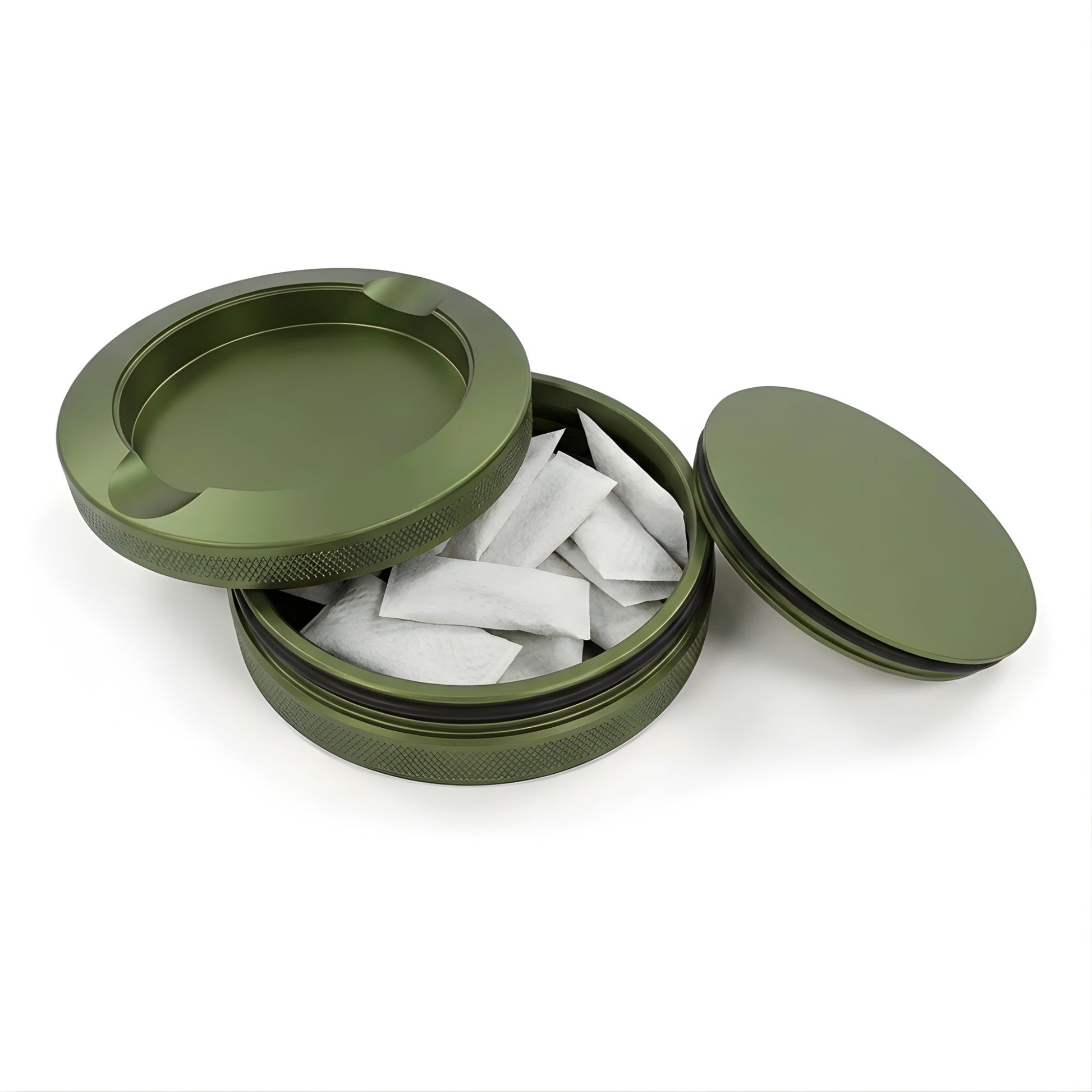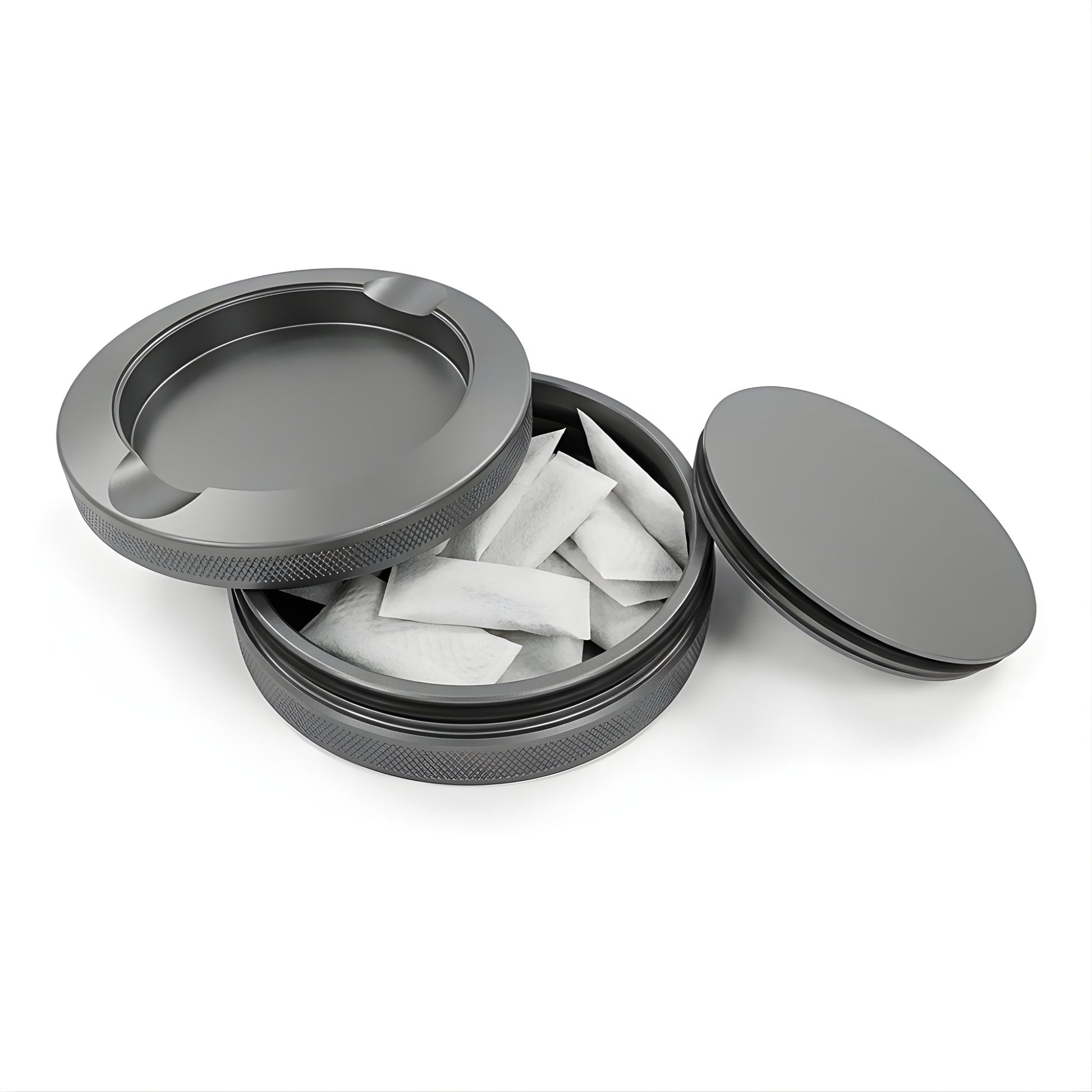 The main chamber stored fresh pouches and is fitted with a rubber seal to keep them fresh. The top chamber is for stashing used pouches till you find a trash can.