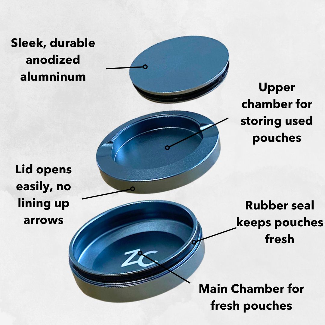 Elevate your pouch experience with Z Caddy premium metal pouch cans. Z Caddy opens smoothly, has an extra compartment for stashing used pouches, is more discrete, stylish, and just feels better to use. Up your pouch game.
